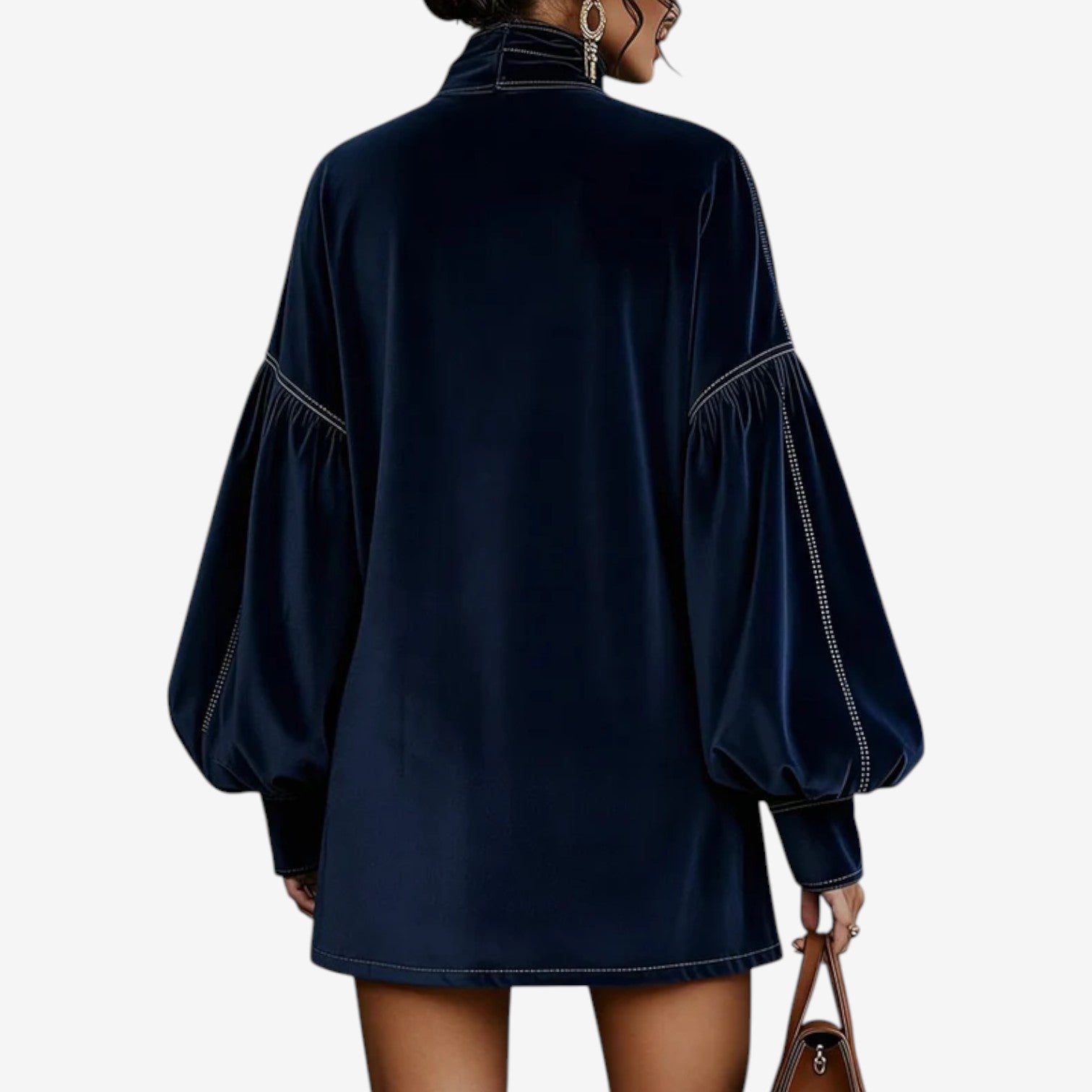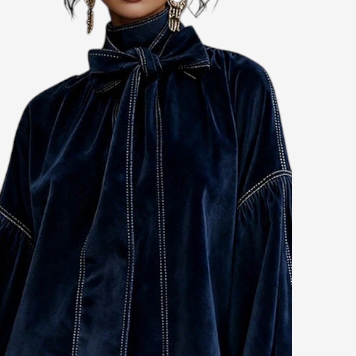 Una texture ricca e vellutata cattura l'attenzione con la sua profondità di colore e il volume delicatamente strutturato. Il tessuto morbido cade senza sforzo, esaltato da una silhouette rilassata e da maniche delicatamente arricciate che creano un movimento aggraziato. Un raffinato dettaglio di cravatta aggiunge un tocco poetico di ispirazione vintage, bilanciando semplicità e discreta raffinatezza. Progettato per passare senza soluzione di continuità dall'eleganza diurna alle intime serate.
